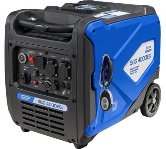 Бензогенератор инверторный SGG 4000ESi в шумопоглащающем кожухe, с электростартом, режимом экономичного расхода топлива — предназначен для подключения к нему потребителей тока общей максимальной мощностью до 3,7 кВт. Переносной компактный инверторный генератор предназначен для питания электроприборов на загородном участке, в походе, на рыбалке. Благодаря использованию в этой модели инверторного преобразователя, на выходе получается стабильный ток, без каких-либо скачков, генератор способен регулировать работу двигателя в зависимости от нагрузки: к примеру, если нагрузка составляет половину от выходной мощности, то и мощность двигателя снижается вдвое; это дает значительную экономию топлива. Инверторные модели получаются более легкими и компактными, чем традиционные генераторы. Благодаря двигателю, специально разработанному под инверторный генератор и особенной конструкции корпуса, удалось значительно понизить уровень шума. Режим ECO обеспечивает экономичный расход топлива, синхронный альтернатор с медными обмотками ротора и статора увеличивает ресурс двигателя. Выход 12 вольт позволяет подзарядить автомобильный аккумулятор в экстренном случае. Инверторный генератор считается оптимальным выбором для нагрузки, чувствительной к качеству тока — такой, как аудиотехника или телевизор.
